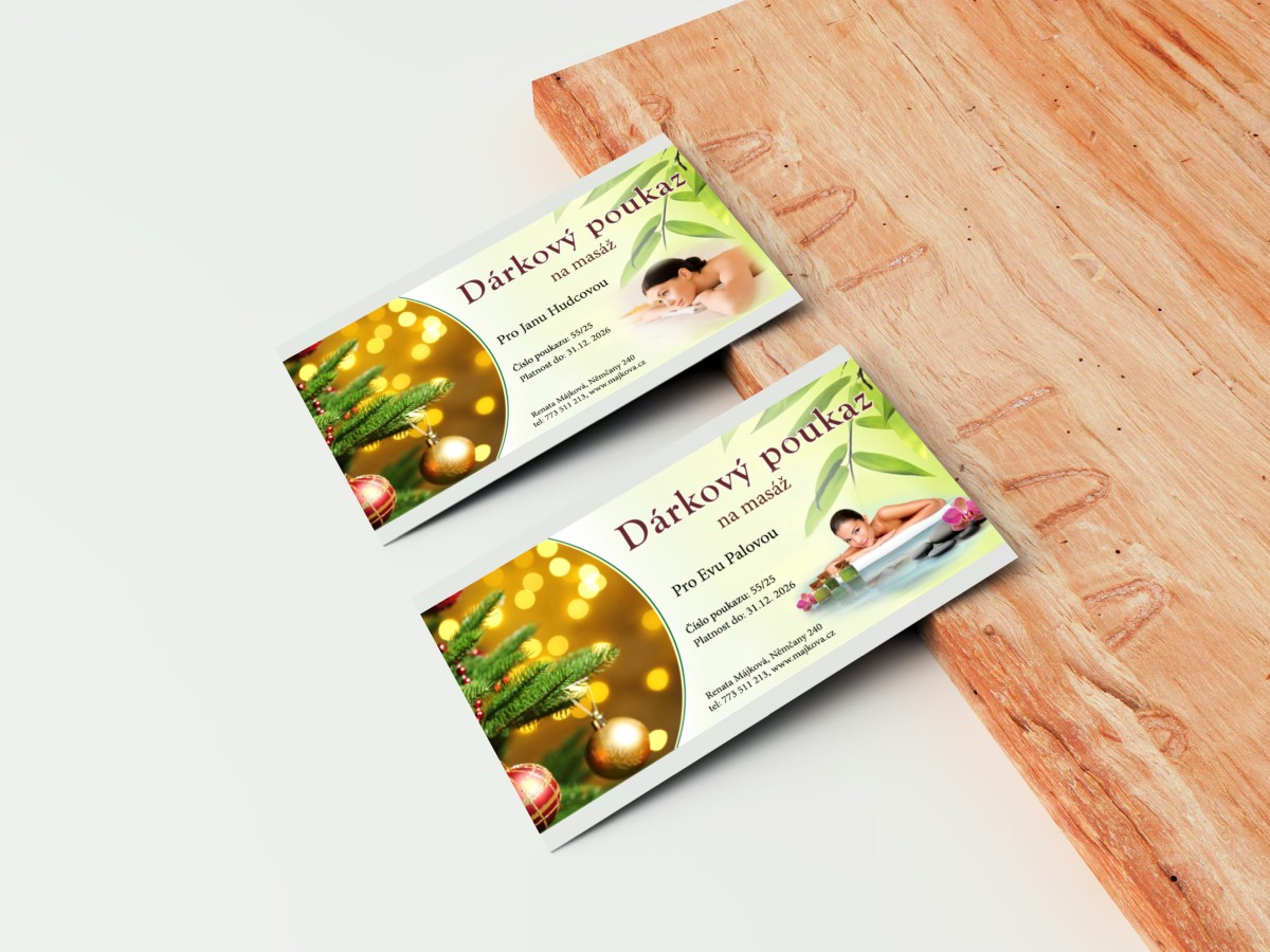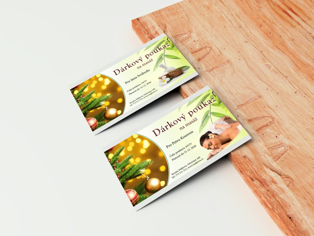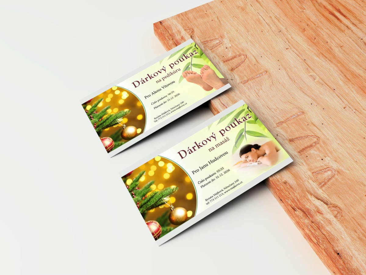 Dárkový poukaz na masáž dle vlastního výběru a na pedikúru Vám ráda vystavím v jakékoliv hodnotě na počkání. Mohu ho také zaslat emailem. Zaplatit ho můžete v hotovosti a nebo převodem na účet. Všechny poukazy jsou přenosné, a jejich platnost je 1 rok. Můžete si vybrat klasické poukazy a nebo poukazy s vánoční tématikou. Darujte svým blízkým zdraví a odpočinek.
